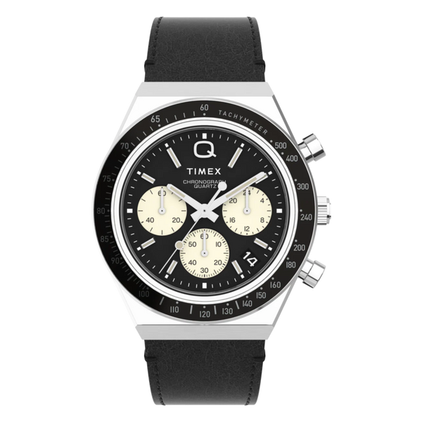 Timex Q Diver TW2V42700 Inspired Chrono (40mm) ‘Reverse Panda’Black Dial / Black Leather Strap Men's Watch