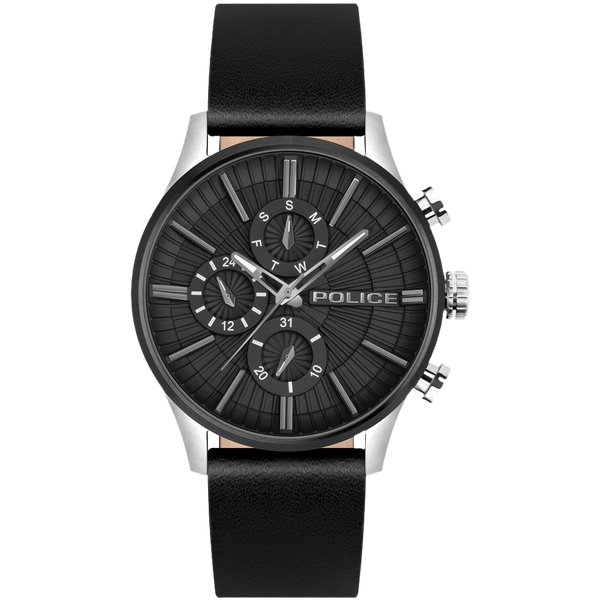 Police BARTER Quartz PEWJF2195040 Multifunction (44mm) Black Dial / Black Leather Strap Men's Watch