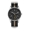 • This watch is finished with a two-tone beige and black NATO-style fabric strap.